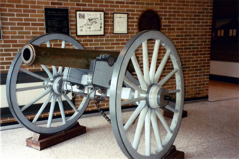 Petoskey News Review Cannon Roared at Hanging of Garfield's Killer Editor's note: In March of 1975, Reg Sharkey asked Mrs. Idena Clark at Petoskey Friendship Center for help in learning the history of Petoskey's wheel mounted Civil War cannon Mrs. Elnora Lee was asked to do the task, and the result follows: After months of researching, the 11/2 inch fine printed paragraph, in a newspaper column equal to today's tea table, tells of the arrival in Petoskey of our No. 27 Civil War Cannon. Much more space was given to the building of the Arlington Hotel, the Rosenthal block, the G.R. & I Railroad depot and the hanging of Charles J. Guiteau. The first regular train run to Mackinaw City was a week later. The Petoskey businessmen joined together and ordered a 1200 pound cannon from Boston. It arrived June 26, 1882 by freight train and was unloaded the next morning. It was in time for the grand 4th of July celebration, when it was to " wake and call us early" with a 100 gun reveille at sun-rise-a custom to prevail on the 4th for some years. It could speak out when the weather was too inclement for parades or speeches, as on July 4, 1884, when "the cannon boomed hour after hour from the high bluff and echoed in the fog over the bay." But the first time our "No. 27" spoke in Petoskey was to herald justice on June 30, 1882 when Charles J. Guiteau was hanged in Washington D.C. The year before he had shot President Garfield. The country was glad that justice had been meted out. Now Petoskey had a loud voice to join in that proclamation. The next year, August 11, 1883, the Lombard Post No. 170 of the Grand Army of the Republic (G.A.R.) was organized in Petoskey with 58 members. Several state officials were in town for the event. The "big gun" spoke again when J.W. Chilson fired the salute at 1 p.m. Mr. J. S. Coffman was one of the gun's owners. We can well believe that it has been fired on many occasions, but it could not have been popular with the newspaper of the era, as there is so little mention of it through the years. Tradition reveals that paths lead one up the valley to old City Park, which became the city Zoo and later, Winter Sports Park. The north hill, about a block west of the north end of Bay View-Ave. was known as Flag Pole Hill in the Park. Here was a flagpole and "No. 27" looking over the top of the hill out onto the bay, as if guarding the city of attack by sea. John Deschermeier visited the zoo and cannon many times as a lad, and recalls that the cannon was still there in 1928. After that, it was stored with its other tube until the Veterans Park was created in 1942. There, in wartime and until 1976, it reminded motorists, that America had given her men to defend our precious country. The local Bicentennial Commission desired in 1975 that the deterioration oak wheels should be preserved. The wheels were removed and worked on for some months by Helmuth Schulz. Just before July 4, 1976 the cannon and wheels were mounted in the foyer of the City-County Building on Division at Lake Streets, and its days of fighting the elements were ended. This cannon — No. 27 — was likely the 27th one made for the first order of 30 cannons that James Ripley, Brigadier General, Chief of Ordinance asked, Nov. 14, 1861, that Revere Copper Company Of Boston, Mass., to manufacture. The tone of the orders show the urgent need for artillery by the North in the first years of the Civil War. From the Revere Company about 343 were ordered within two years, plus orders to other companies. Chief Ripley begged for an output of five cannons per week. The cannon's war history not surfaced, as from which battlefield it spoke out for victory and unity or under which general it served. But as it was shipped from Boston and was of the first order, it likely stayed in the north eastern part of the country. We will comprehend its unutterable history by general written accounts of bravery, courage and endurance in those terrible years left of the Civil War that ended with a united country; a war that veterans speaking of each others as "Comrades" and striving to meet at annual encampments. Pride and certainty of home and country was their reward for the suffering and privation that this cannon has witnessed. (Researched and compiled by Mrs. Leonard (Elnora) Lee, with appreciation to Peggy Blount at museum library for missing clue.)
