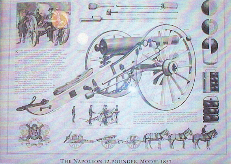 12 Pound Bronze Napoleon The 1,191 lbs. Revere Cooper Co. 12 pound bronze Napoleon cannon, Modal 1857, Registry # 27, inspected by Thomas J. Rodman in 1862, has been disassembled & is being stored. The cannon was at one time on display at the City/County Building in Petoskey but do to remodeling and some restoration needs it has been put in storage. It is the intent of the County to put the cannon on indoor display at the yet to be built County Museum. The tube is in very good condition & all of the hardware is intact. Depending on the desired out come, restoration on the carriage could vary. There were some makings on the left trunnion I could not read & I was unable to turn the tube over to read the right trunnion or confirm the US stamp on the top of the cannon. I was able to feel the top of the cannon and I believe the US stamp is in place. Information taken from large chart on wall, near the Napoleon 12-Pounder Cannon, in lobby of Petoskey City-County Building. Known variously as the "Gun Howitzer" "Light 12-Pounder Gun, Model 1857" the most common name assigned to this popular artillery piece was the "Napoleon" patterned after a French prototype associated with Louis Napoleon. The American version proved a favorite of both sides during the Civil War. With a barrel weight of over 1200 lbs. This 4.62 inch diameter smooth bore had an impressive range of just under a mile. Shot shell and spherical cases could be fired as well as canister, which took a deadly toll on Infantry and Cavalry up to 1/4 of a mile. This diversity gave this weapon a capability both as a field piece and to a lesser degree for siege work, usually employed on a modified "24 Pounder Field Howitzer Carriage." It's relative accuracy and variety of uses were only partially responsible for the 1857'reputation. The Napoleon's safety record also won it the support of artillery men both North and South. Research Material: This is a copy of the Research Material that Mrs. Elnora Lee used in writing her story "Our Cannon On Wheels" completed on February 14, 1977.